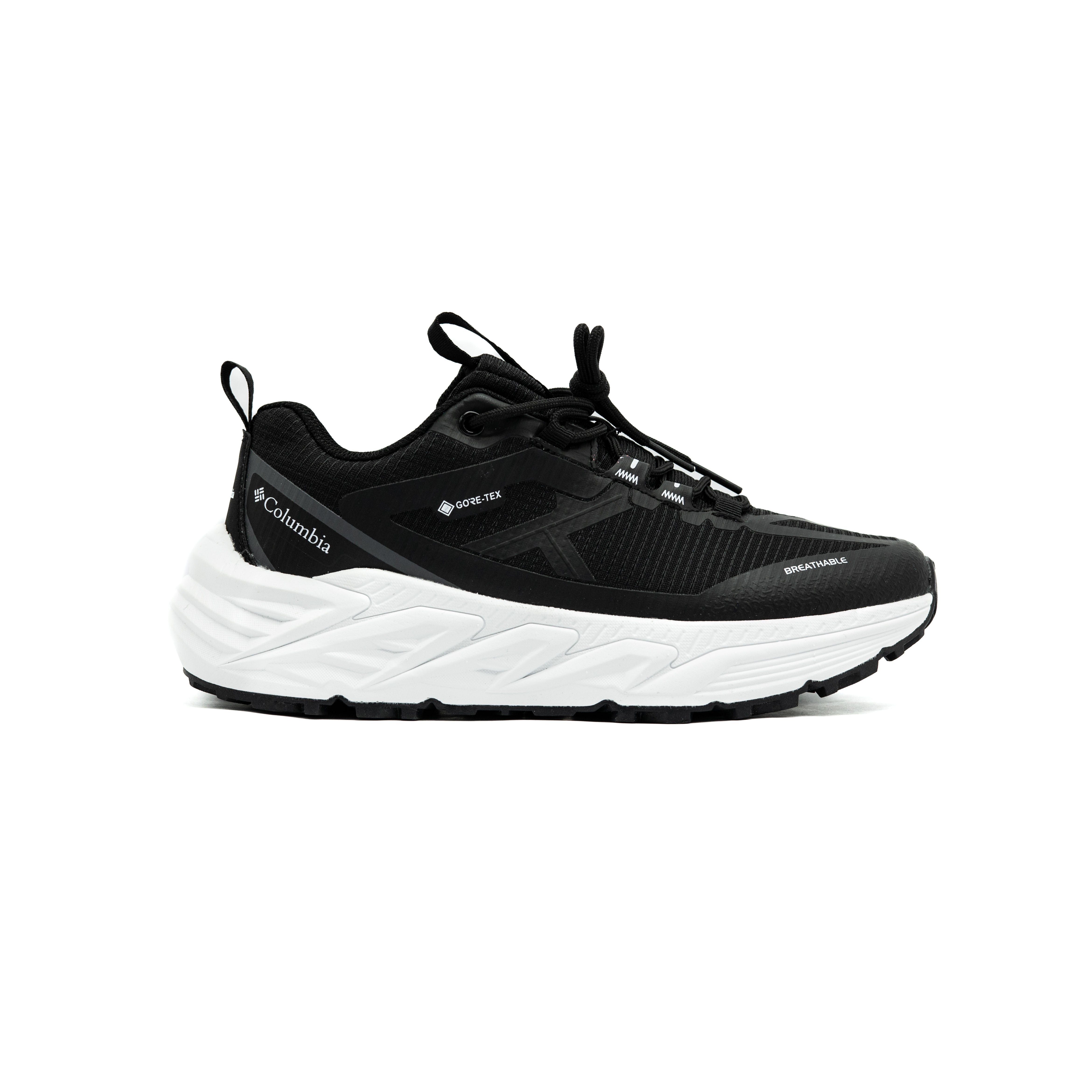 These rugged, low-top shoes are designed for trail running and outdoor activities. They feature a sleek, all-black upper made from a mix of durable mesh and synthetic overlays. The shoe is built with a sturdy, cushioned black midsole and a contrasting brown gum rubber outsole with a multi-directional grip for superior traction on trails. The design emphasizes lightweight durability and comfort.